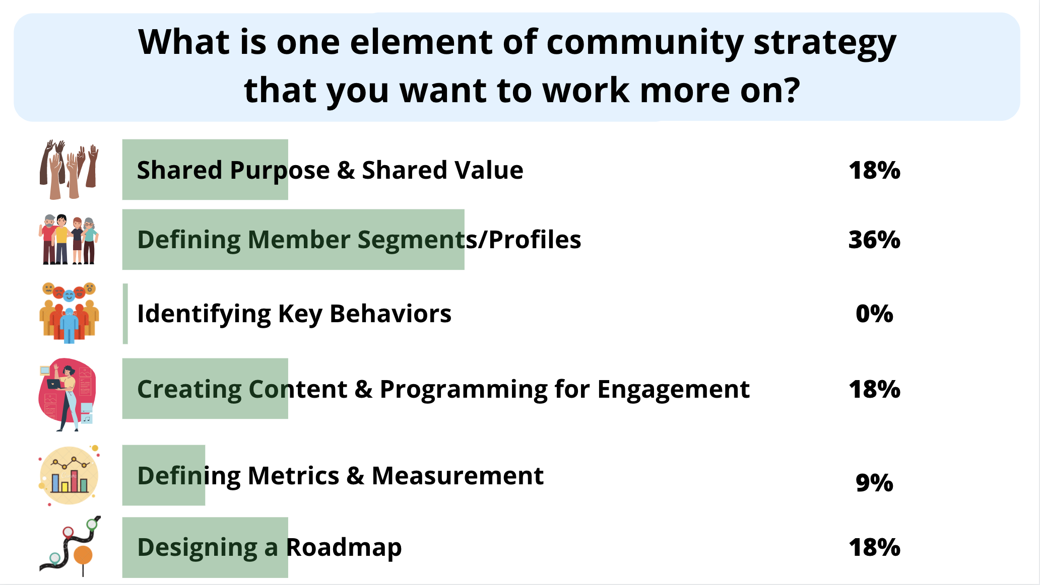 The poll results show that there is a pretty even split amongst the choices, with the most respondents wanting to focus more on their members and understanding their goals and priorities. Coming in close behind member segments and profiles is determining shared purpose and shared value, creating content & programming for engagement, and designing a roadmap, which are all more complicated, yet foundational elements of community strategy.
