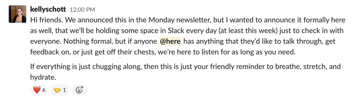 If you just want to take a little break during the day, we're going to be hosting a quick check-in at 12pm ET every day this week (and possibly longer) to just touch base and open up a space for anyone to discuss what's on their minds. Whether it's personal or a professional task, or if you just need a second to catch your breath, we encourage you to join in over in